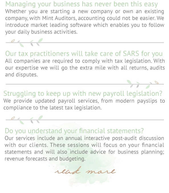 Directors: M Vissser CA (SA) & T Visser CA (SA) | 132 Piet Retief Boulevard, Vanderbijlpark, 1911 | minette@mintauditors.com / talita@mintauditors.com | 084 820 2602 / 084 311 0201